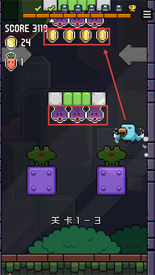 2、优先收集上方金币,注意躲避紫色怪物,高效获取资源以推进关卡进度。