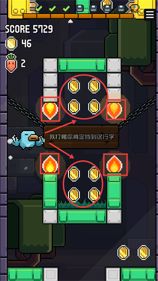 4、遇到火焰与金币并存的场景,规划移动路线,规避火焰陷阱,收集金币。