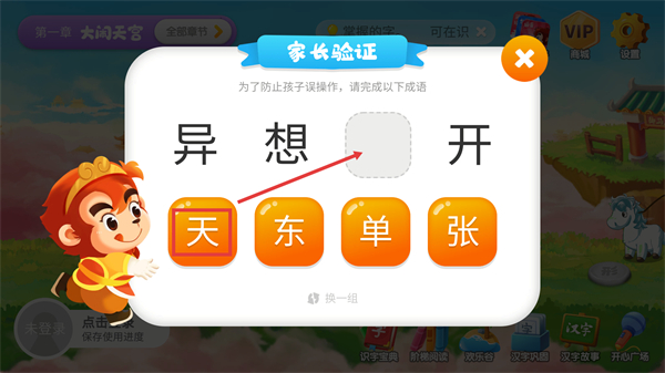 2、触发【家长验证】弹窗后,选择【天】字完成“异想天开”的成语填空,完成验证即可继续操作,防止孩子误触。