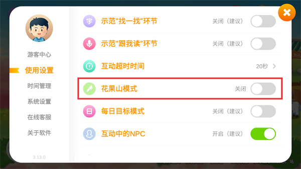 4、在【使用设置】页面中,可找到【花果山模式】开关,可进行开启或关闭。