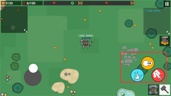 3、点击右侧技能按钮(如炸弹、剑形图标),可释放技能获取资源或清理障碍,合理使用技能提升资源收集效率。