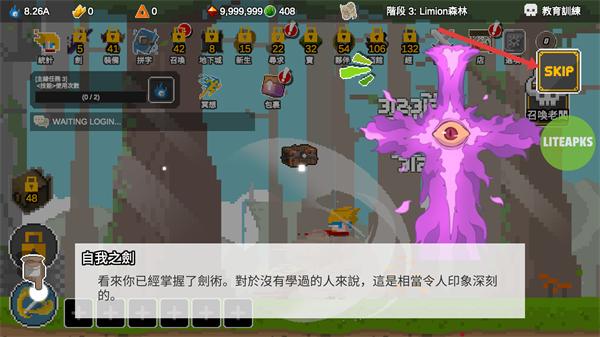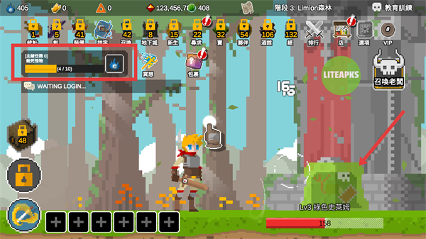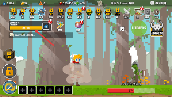 1、关注红色框内的【技能经验】进度条,积累经验提升技能等级,同时挑战右侧怪物获取资源。