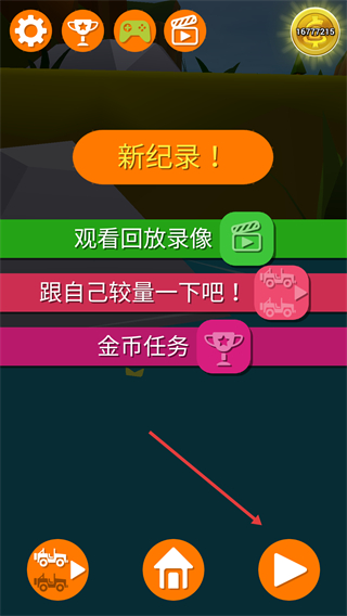 4、创造新的游戏记录后,点击继续按钮开启下一轮挑战,参与金币任务等活动,提升游戏进程,不断突破更高的行驶记录。