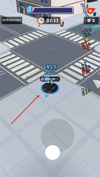 1、初期操控【LVL1】黑洞移动,优先吞噬街道小物体如行人与路障,积累成长基础资源,推进【Eat10Bystanders】目标进度。