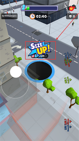 2、吞噬触发【SIZEUP】提示后黑洞体积增大,可吞树木与路灯等更大物体,继续在街道探索提升成长效率。