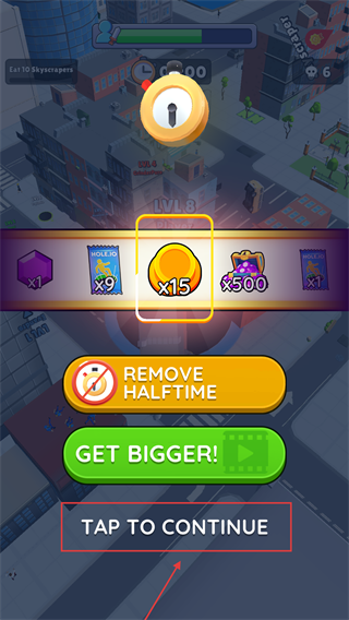 4、结算界面得【金币x15】等奖励,选【GETBIGGER】按钮或点【TAPTOCONTINUE】,继续下局积累资源。