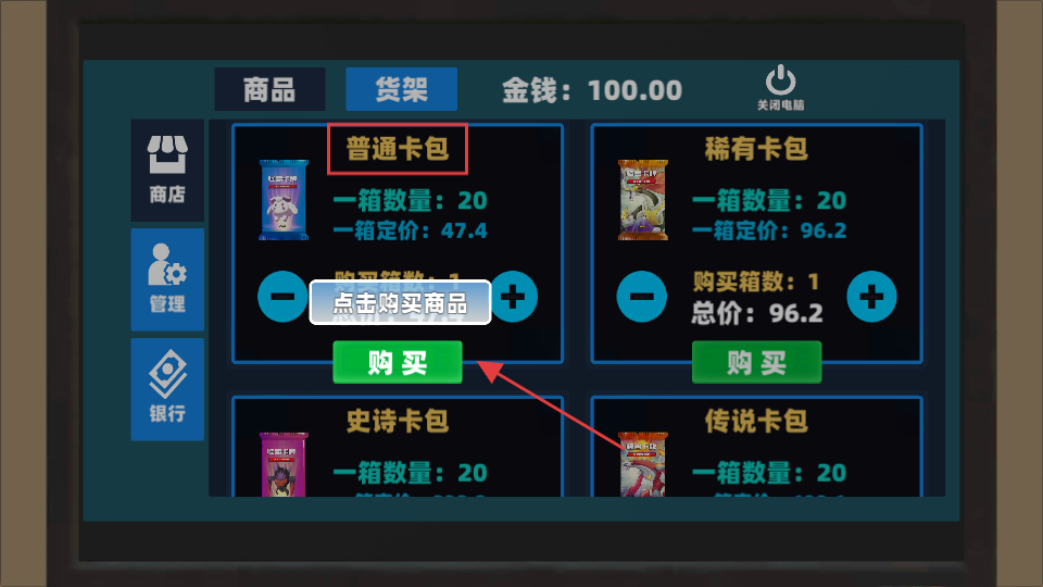 2、选购【普通卡包】,可调整购买箱数,结合资金与需求,点击【购买】补充商品,丰富货架货品。