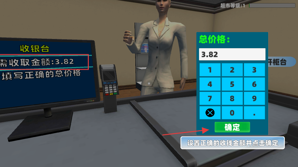 4、收银时,按【需收取金额-3.82】输入总价格,点击【确定】完成收银,确保金额准确。