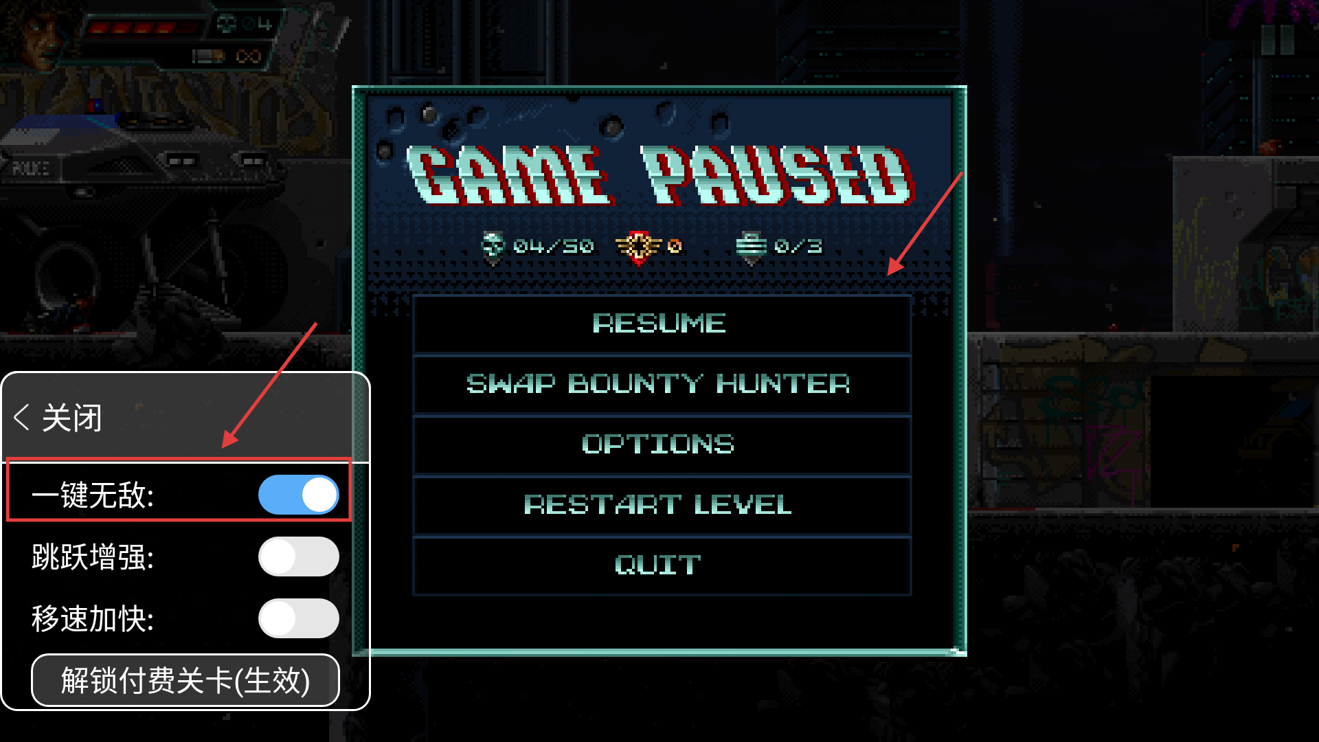 1、在游戏暂停界面中,玩家可切换赏金猎人角色或调整一键无敌等辅助设置,有效助力应对硬核动作射击的高难度挑战。