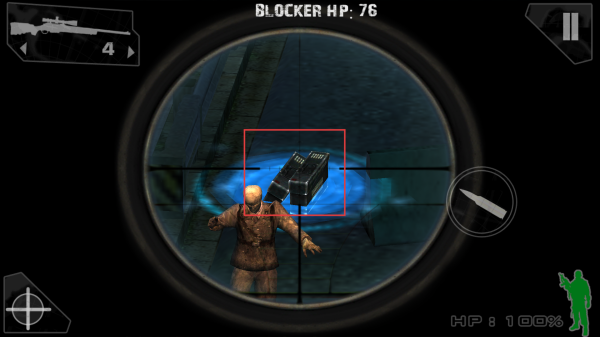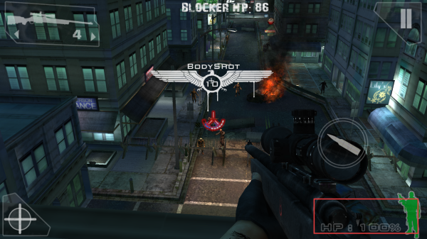 3、在战斗场景中瞄准僵尸射击,积累击杀数,同时关注自身HP状态以维持生存。