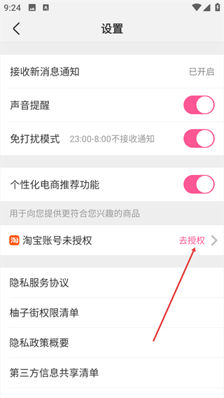 2、进入【设置】界面后,看到【淘宝账号未授权】选项,点击其右侧的【去授权】按钮。