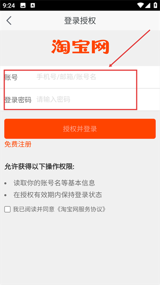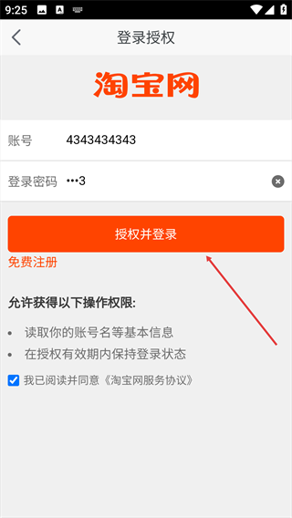 4、填好后,点击【授权并登录】按钮,完成淘宝账号授权。