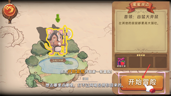 1、在【蜜蜜湖边】挑战【凶猛大斧鼠】-其比普通鼠高大强壮,点击【开始冒险】开启挑战,完成后可获【草莓礼盒】。