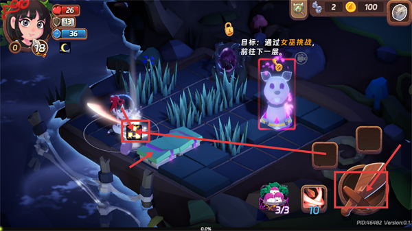 2、目标为通过女巫挑战前往下一层,可借助界面道具与攻击按钮,应对场景敌人以推进冒险进程。