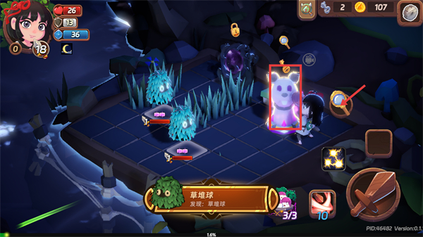 4、遭遇【草堆球】敌人,运用已选的【雷电冲击】法术,配合攻击功能,击败敌人以继续推进冒险。