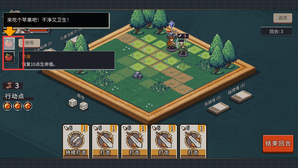 4、使用苹果,恢复10点生命值,保持角色生存,继续冒险。