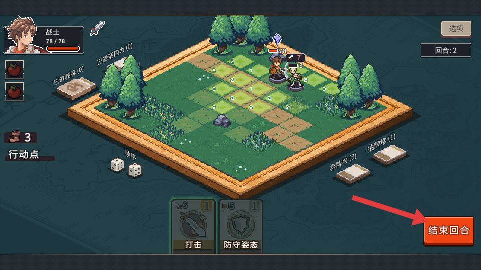 3、点击【结束回合】,完成当前回合操作,进入下一阶段。