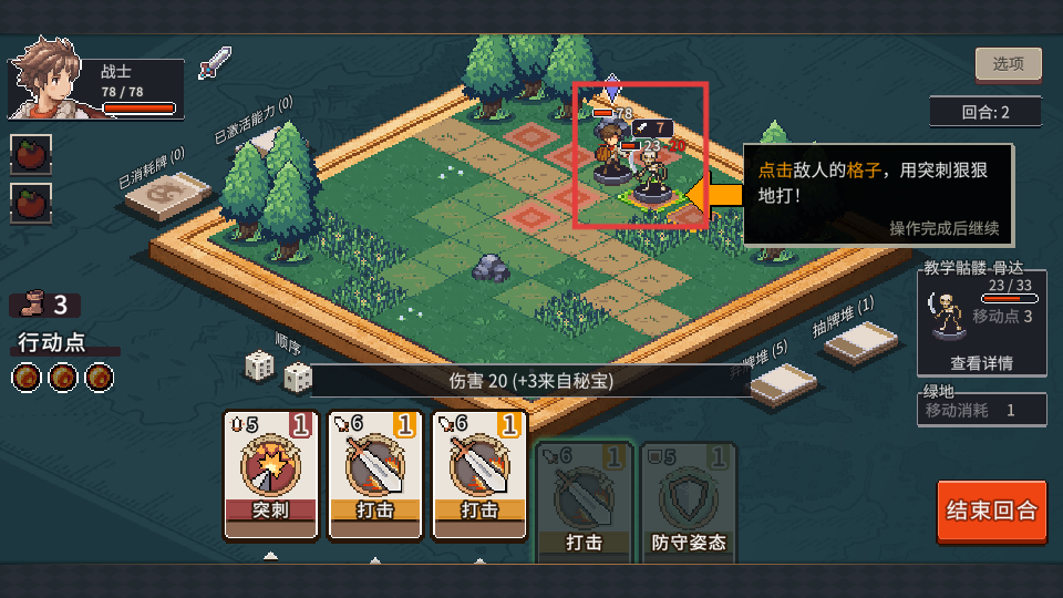 2、点击敌人格子,用突刺攻击,提升伤害,推进战斗进程。