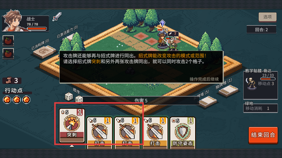 1、选择招式牌【突刺】和攻击牌同出,改变攻击模式或范围,推进战斗。