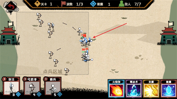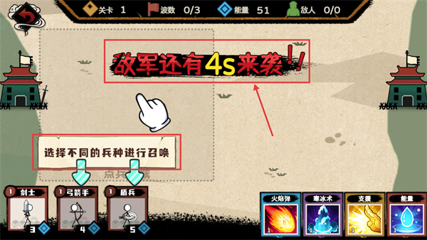 2、敌军来袭前,根据能量选择【剑士】-【弓箭手】-【盾兵】召唤,提前布局应对敌方进攻。