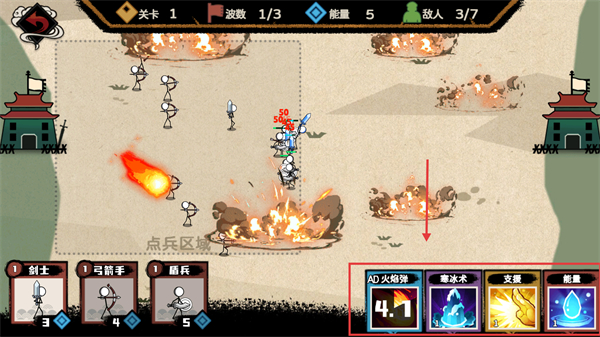 4、战斗中使用【火焰弹】等战场技能,对敌方集群造成范围伤害,有效推进胜利。
