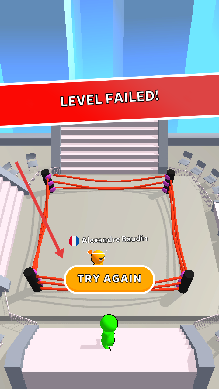 4、若关卡失败LEVELFAILED,点击TRYAGAIN按钮重新挑战,调整策略以击败更多对手。