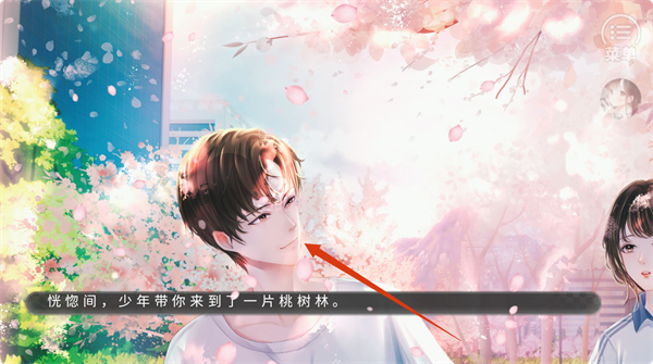 3、在桃树林场景中,根据文本“恍惚间,少年带你来到了一片桃树林”,跟随少年探索,解锁浪漫场景剧情。