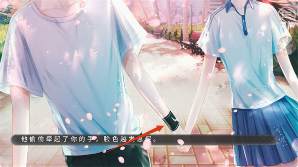 4、在樱花步道场景中,留意文本“他偷偷牵起了你的手,脸色越发急促”,感受角色互动,推进感情线剧情。