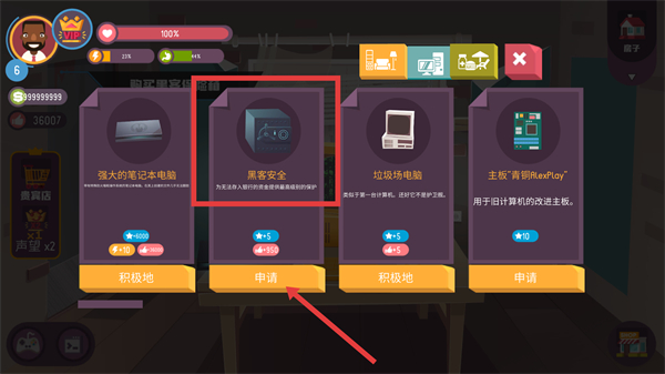 4、点击红框内的“黑客安全”道具下方的“申请”按钮,完成保险柜的购买申请,推进任务。