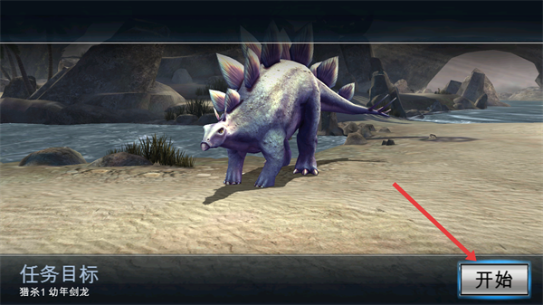 1、确认【任务目标-猎杀1幼年剑龙】,点击界面右下角的【开始】按钮,即可进入对应狩猎场景。