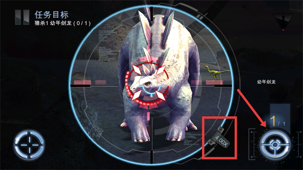 3、滑动放大焦距,精准瞄准【幼年剑龙】的要害部位,以此提升本次射击的命中效率。
