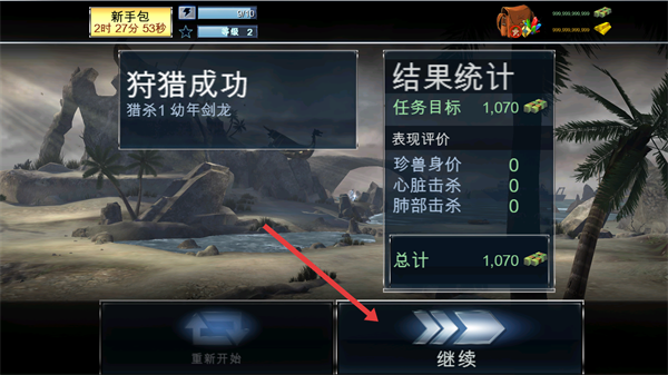 4、完成【猎杀1幼年剑龙】的任务后,可获取金币奖励,点击界面的【继续】按钮,进入后续的游戏流程。