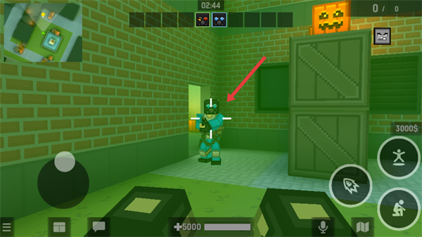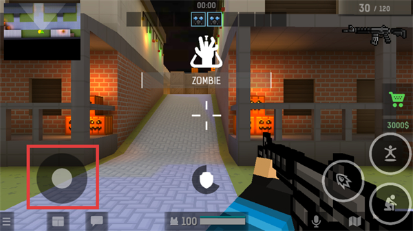 2、在游戏中,使用左下角的虚拟摇杆(红色框内区域)操控角色移动,探索地图并寻找敌人。
