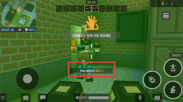4、成功感染敌人(如红色框内显示“YOU-INFECT-BOT_1”)后,可获得相应的游戏胜利提示,不断感染敌人以赢得回合胜利。