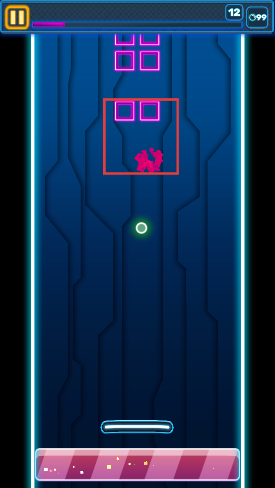 2、操控绿色小球撞击粉色方块,注意调整角度和力度,高效清除方块以获取分数。