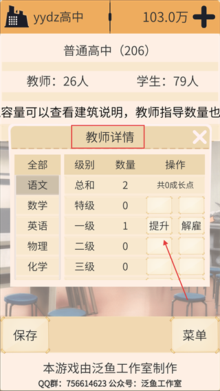 1、查看【教师详情】界面,优先提升特级教师数量,特级教师可增加学校声望,助力招募优秀学生。