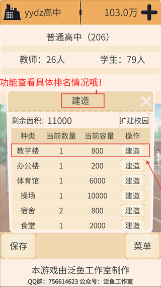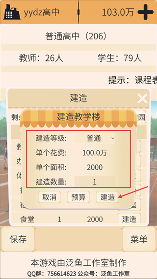 3、建造教学楼前确认【普通-100.0万-2000-1】参数,确保资金与面积充足,避免学校破产影响发展。