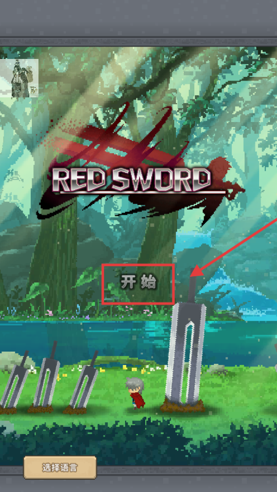 1、进入【REDSWORD】游戏界面,先点击【开始】按钮,可选择语言后开启像素风角色冒险之旅,操作简单易上手。