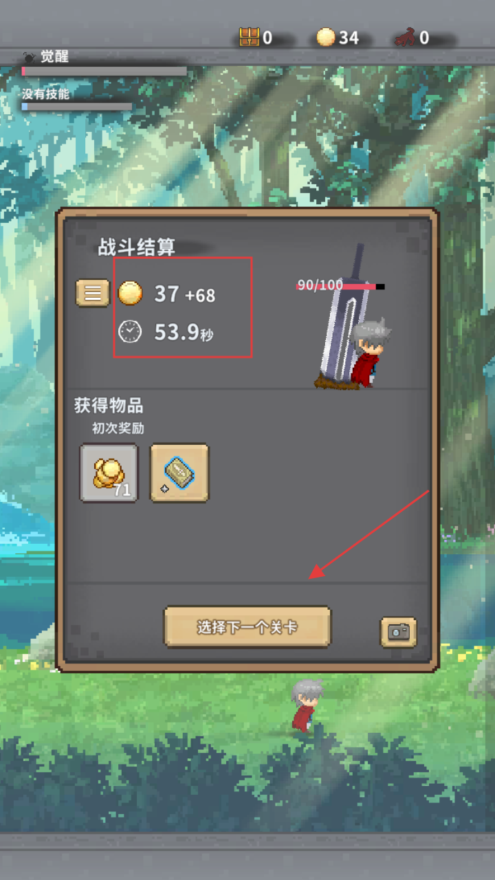 4、战斗结束查看【37+68】金币与【53.9秒】时长,收集获得物品后,点击【选择下一个关卡】进入新挑战。