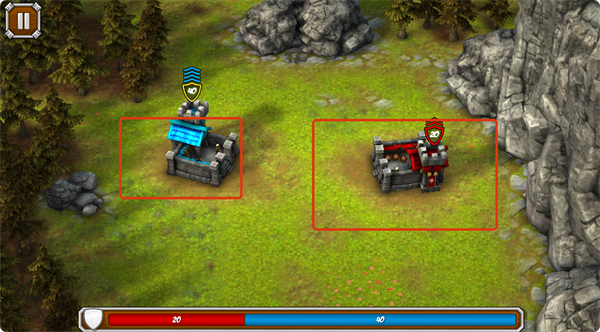 2、在游戏场景中,观察不同建筑的属性值,如蓝色建筑【40】、红色建筑【20】,制定攻防策略。
