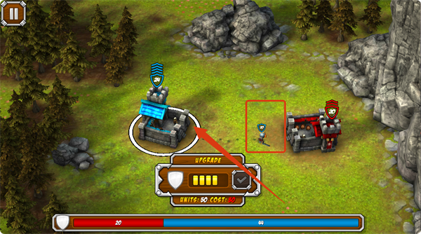 3、点击蓝色建筑,选择【UPGRADE】进行升级,提升建筑实力,同时派遣单位进攻敌方建筑。