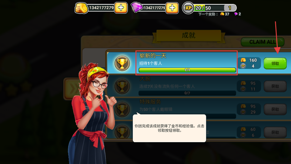 1、完成【崭新的一天】成就后点击【领取】按钮获取【金币】-【经验值】,为餐车经营积累资源提升等级。