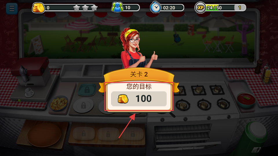 2、进入【关卡2】后明确目标为赚取【100】【金币】,提前熟悉餐车设备布局以高效完成订单。