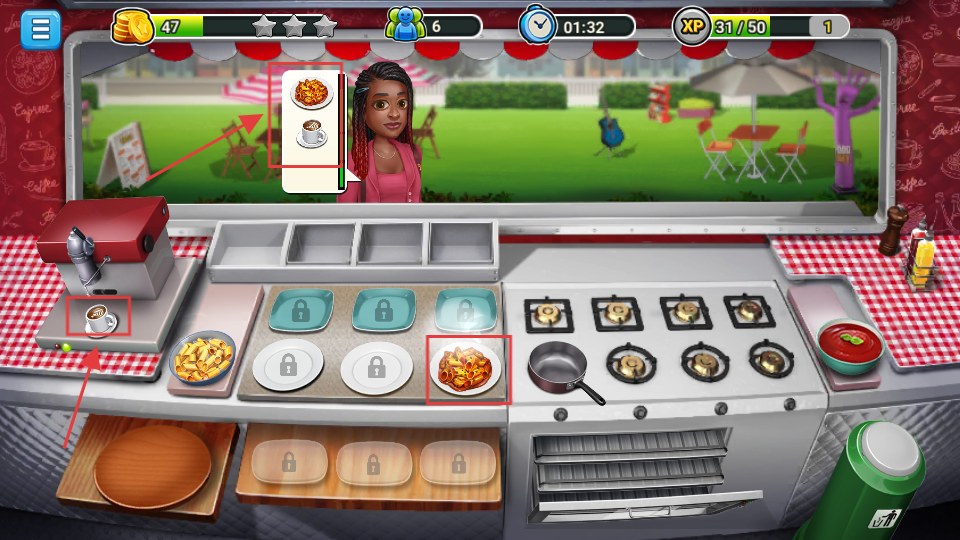 3、用赚取的金币强化厨房设施,比如提高摆盘数量或咖啡机自动加满的速度。
