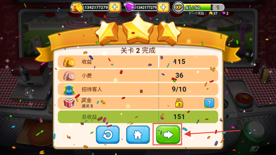 4、关卡结束后查看【收益】-【小费】等数据,点击绿色按钮进入下一关继续餐车经营挑战。