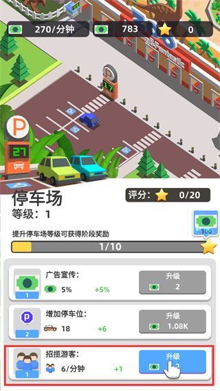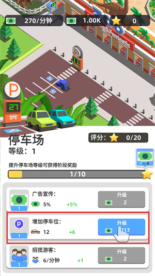 1、根据提示点击箭头标注的按钮,升级停车场。