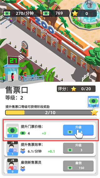 4、提升售票口的等级,可升级门票价格和售票效率,增加动物园的门票收益,优化售票环节的运营。