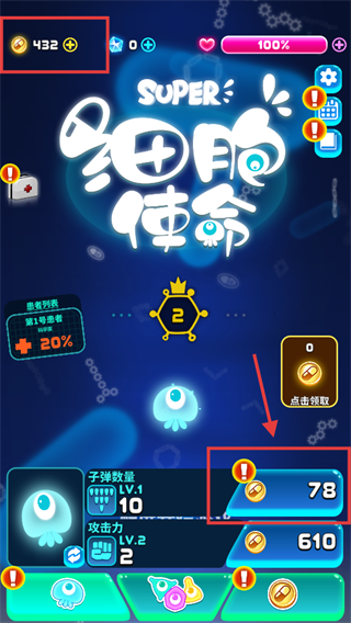 1、关注金币【432】使用,点击带【!】的【78】升级项,提升细胞战力以备战。