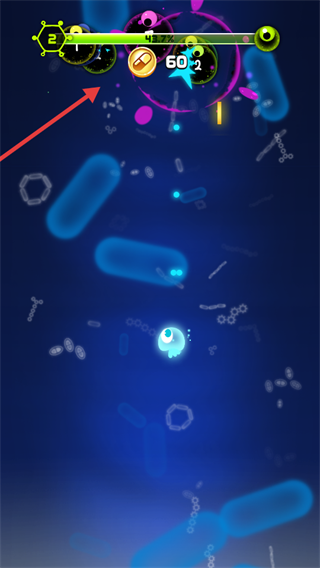 2、控制细胞移动射击上方病毒,收集【60】金币及道具,推进战斗进度。