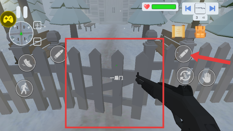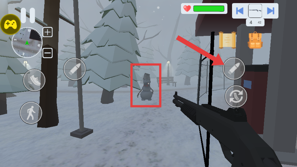 2、遇到雪人敌人时,点击右侧射击按钮消灭它们,保障自身安全。